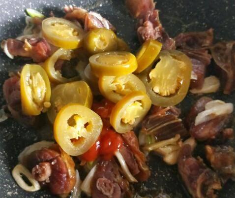 4、加辣椒酱。加辣椒圈,再放少许生抽和鸡精调味。