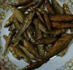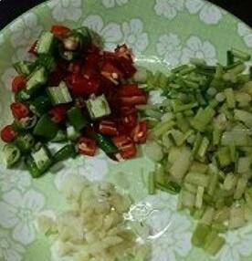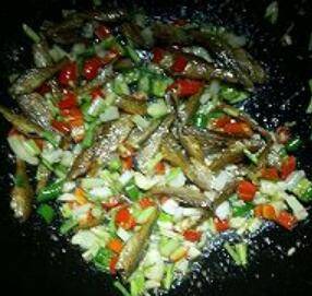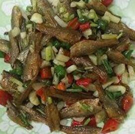 用料:小干鱼15个左右、嫩姜叶一把、鲜红绿线椒三根、大蒜二瓣、料酒、盐、鸡精、糖适量。