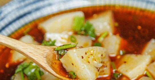 米豆腐放置不烫手后取出来切成小块。再调一碗酱汁, 5大勺水、2大勺醋、1大勺生抽、1小勺花椒油、1小勺盐,搅拌均匀浇在米豆腐上。