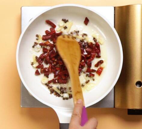 加入花椒,翻炒均匀,加入干辣椒,翻炒均匀。
