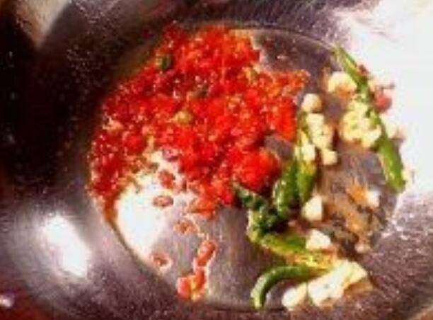 5、在锅中保留的底油中,放蒜末,青椒,剁椒炒香。