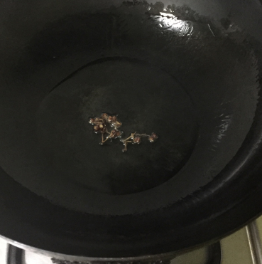 炒锅加油,待油开始冒烟,放几颗花椒,待花椒变色后将花椒拣出。