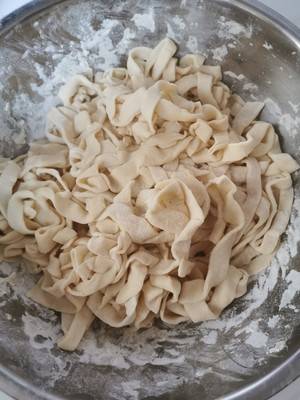 1、手擀面擀好备用,锅中放冷水煮开,放入手擀面煮熟,捞出放冷水备用。