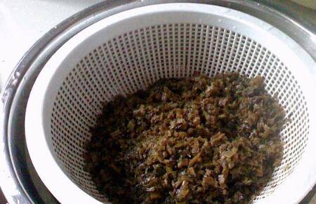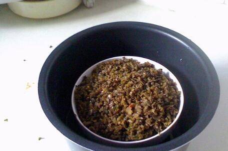 把图7的酱汁淋入肉碗内,然后雪菜放在面上,入高压锅压蒸30分钟,蒸好后,反倒扣即可。