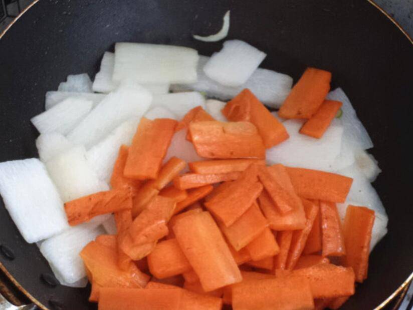 5、胡萝卜入锅炒。