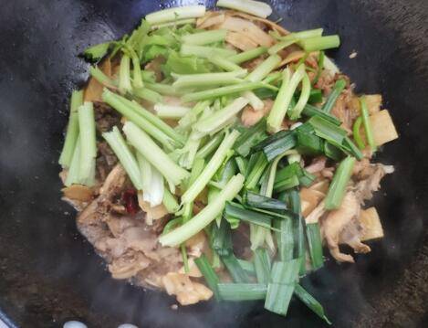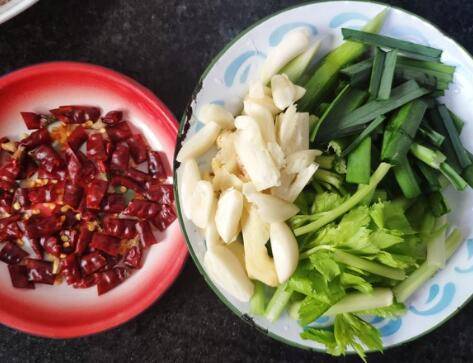 甜笋切片,炒干水分。大蒜和姜切片,芹菜、蒜苗、干辣椒切段。