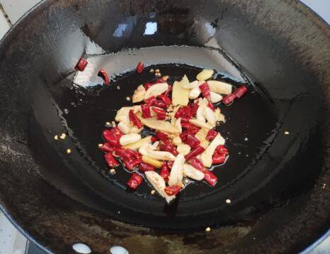 锅中烧油,炒香大蒜、姜片、辣椒。