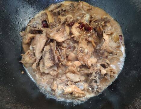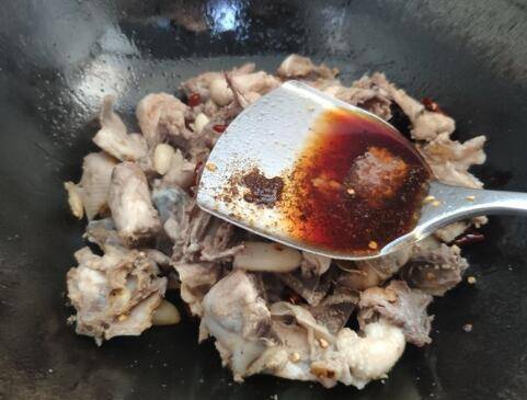 放入鸡架翻炒,放料酒、盐、白糖、胡椒粉、生抽。