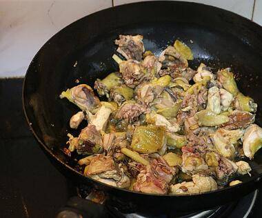 热锅凉油,加入生姜,大蒜煸香,加入鸡肉,料酒翻炒至半熟 。