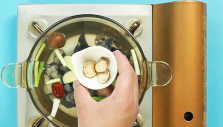 3、放入红枣、枸杞、桂圆、黄芪、白芍、党参、当归。