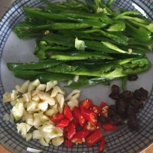 2、青椒切丝、小米辣切段、蒜切末、豆豉备用。