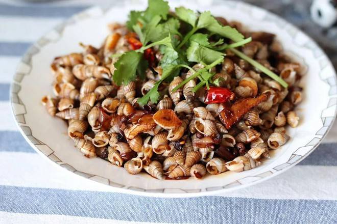 用料:海螺丝500克、葱花适量、蒜片适量、姜丝适量、干辣椒适量、花椒适量、酱油适量、香菜适量、色拉油适量。