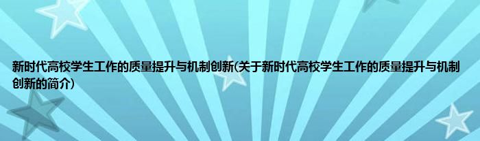 新时代高校学生工作的质量提升与机制创新(关于新时代高校学生工作的质量提升与机制创新的简介)