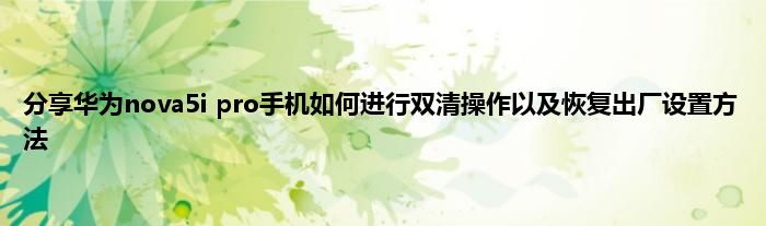 最佳答案今天弟哥也来说一下这个分享华为nova5i pro手机如何进行双清操作以及恢复出厂设置方法相关的文章,这个操作其实不复杂,一起来看看吧: 1、双清是什么? 给大家介绍一下什么是双清,双清其实就是进入REC界面,选择操作“恢复出厂设置”+“清除cache分区”。所以说双清其实是包...