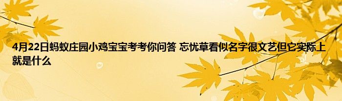 4月22日蚂蚁庄园小鸡宝宝考考你问答 忘忧草看似名字很文艺但它实际上就是,欢迎大家来到这里,能进来的小伙伴都有玩蚂蚁庄园的,支付宝蚂蚁庄园每天都会在小课堂更新一道题目,答对即可领取小鸡饲料180G,4月22日蚂蚁庄园问题是:忘忧草看似名字很文艺但它实际上就是?很多小伙伴都不知道忘忧草看似名字很文艺但它实际上就是这个问题的答案是什么,那么小编就为大家分享下4月22日蚂蚁庄园课题问题的答案,希望对大家有所帮助!