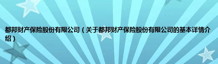 1、都邦财产保险股份有限公司(Du-BangProperty\\u0026CasualtyInsuranceCompanyLtd.)是经中国保险监督管理委员会批准,于2005年10月19日开业的全国性财产保险公司,注册地为吉林省吉林市。